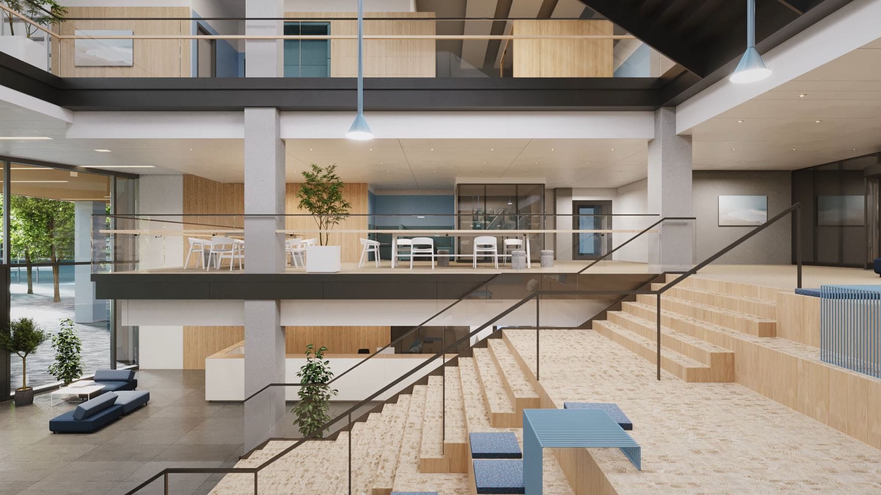 Aus der öffentlichen Fläche im Erdgeschoss führt eine Freitreppe ins Mezzaningeschoss mit einem Co-Working Bereich. Die Magistralen im Inneren sind der kommunikative Markplatz und ermöglichen mit einer offenen Treppe eine geschossübergreifende Verbindung. Angenehme, mehrgeschossige Wintergärten fördern zudem eine moderne Großzügigkeit.
