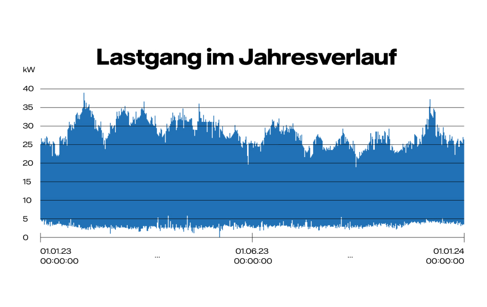 In einer grafischen Darstellung des Strom-Lastgangs wird typischerweise auf der Y-Achse die Leistung in kW und auf der X-Achse die Zeit (in der Regel ein Jahr) dargestellt. Die viertelstündlichen Leistungswerte heben Spitzen beim Stromverbrauch hervor, anhand derer sich das Verbrauchsverhalten auswerten und optimieren lässt.