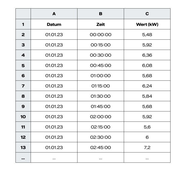 Die Daten des Lastgangs werden in einer tabellarischen Übersicht gesammelt, mit der Kund:innen eine Aufschlüsselung der erfassten Leistungswerte erhalten. Die erste Spalte zeigt dabei in der Regel das Datum, die zweite die Uhrzeit und die dritte Spalte die gemessenen Leistungswerte in Kilowatt (kW).