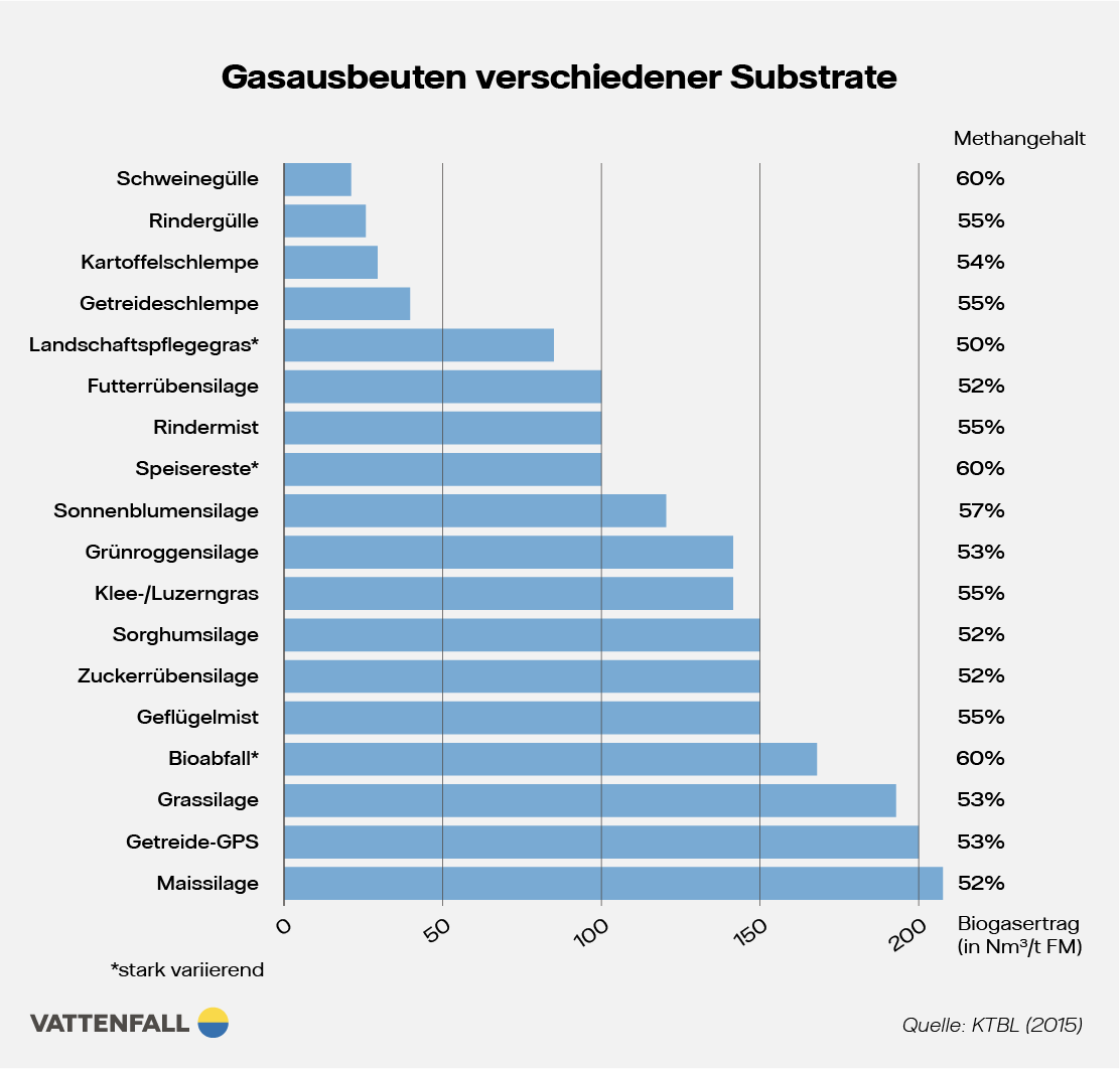 Als Substrat eignen sich unterschiedlichste Stoffe pflanzlichen oder tierischen Ursprungs. Je nachdem, was in der Biogasanlage genutzt wird, entsteht unterschiedlich viel Biogas. Die sogenannten Energiepflanzen, darunter Mais, Raps und bestimmte Getreidesorten, liefern besonders viel Biogas, weil sie pro Hektar sehr viel Biomasse für die Vergärung liefern. Mais ist die wichtigste Energiepflanze: Durch den hohen Stärke- und Zuckeranteil bringt er bei der Gasausbeute besonders hohe Erträge.