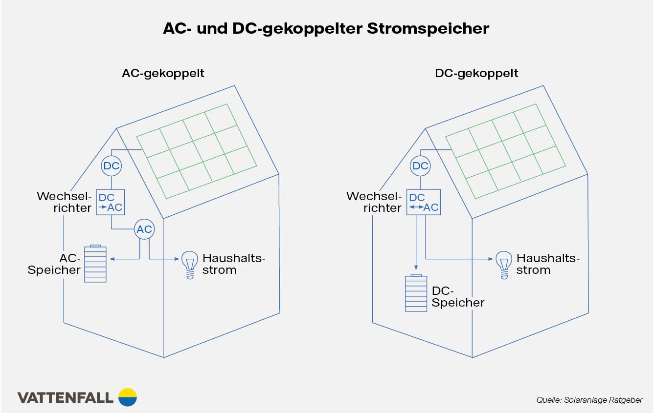 Die meisten PV-Anlagen werden bereits mit einem Stromspeicher ausgestattet, sodass sich der Eigenverbrauch gut erhöhen lässt. Andernfalls kann sich eine Nachrüstung lohnen. Zu empfehlen sind dabei Wechselstromspeicher (AC-Speicher), die im Vergleich zu Gleichstromspeichern (DC-Speichern) flexibler und mit jedem Wechselrichter kombinierbar sind.